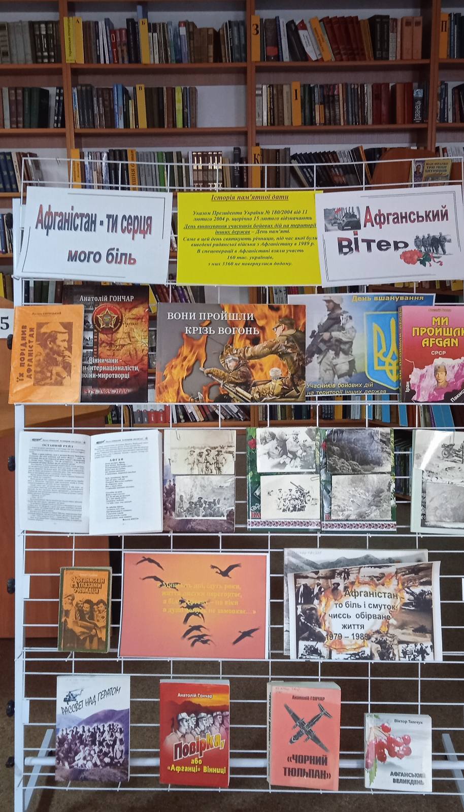 Щорічно 15 лютого в Україні відзначається День вшанування учасників бойових дій на території інших держав. До цієї дати в бібліотеці оформлена виставка книг та світлин, де читачі мають можливість ознайомитись з матеріалами, які висвітлюють вищезгадані події.