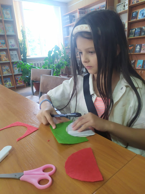 Кавуни полюбляють всі - і дорослі, і малі. Цій найбільшій ягоді присвятили навіть свято, яке відзначали 3 серпня. А наші гуртківці сьогодні виготовили скибку кавуна з фетру. За кільце його можна почепити до сумки чи рюкзака, як брелок. За роботою побесідували про користь кавунів і дізналися цікаві факти про ягідку.